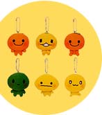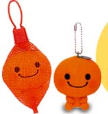 | ぶら2みかんぼうや(¥400) ボールチェーン付のぶら2マスコットにみかんの香りの香り玉つき!! 仲間たちも勢揃い!(各¥400) ネットに入って本物のみかんみたい!! |