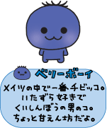 | 今回は新しいお友達が増えました! イチゴちゃんはとびっきり元気な女の子。 ピーチンはやさしい恥ずかしがりやさん。 ベリーボーイはいたずら好きのやんちゃっこ。 みんなはどの子がお気に入りかな? あなたや、お友達にそっくりだったりして・・? |